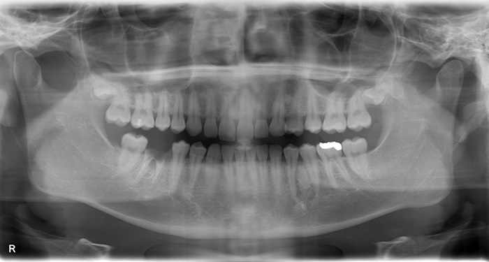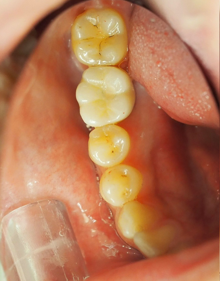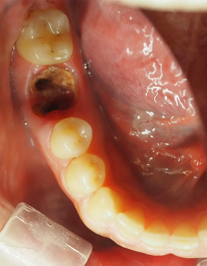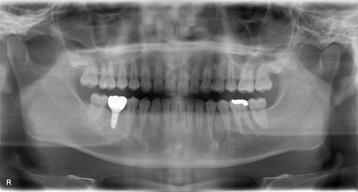| 治療内容 | 右下の奥歯のむし歯が進行し、根だけになっており、かぶせものが再々とれ、痛みもありました。 残った根の部分もヒビが入っており、そこから細菌感染を起こし、骨の破壊を認めた為、やむを得ず、抜歯し、インプラントにて修復する事としました。 再び、噛めるようになり、患者様も満足頂けました。 これからはインプラントも含めた、歯周メインテナンスを開始し、口腔状態の維持につとめていきます。 |