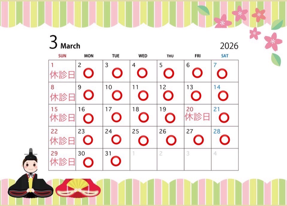 3月の診療カレンダーです。宜しくお願い致します。